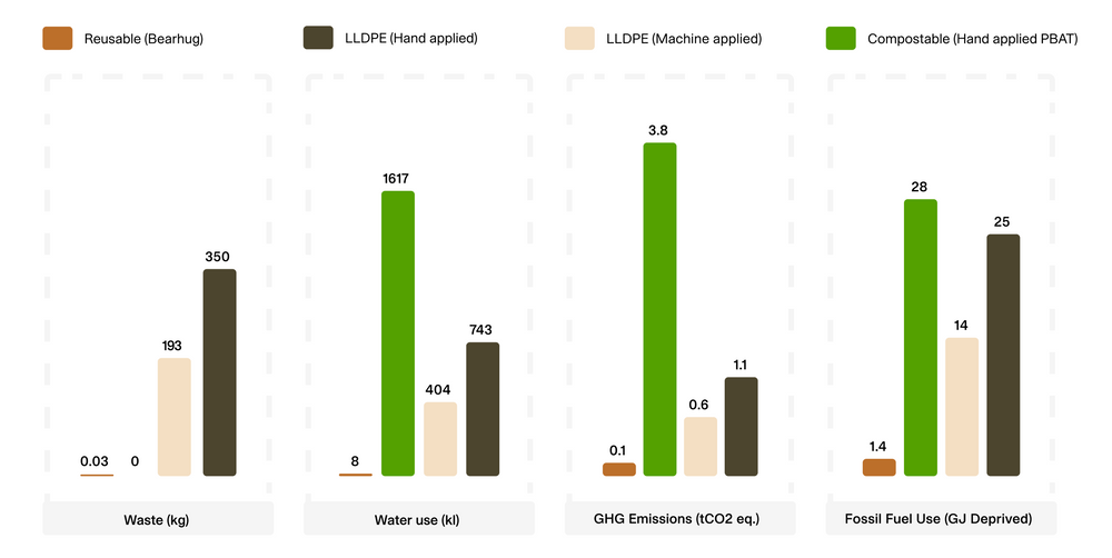 The image on the left shows results from 1000 uses of each alternative, and factors in a 50km return journey each time a reusable wrap is used. After 8 re-uses, you'll save on plastic. After 19 re-uses, you'll lower your GHG emissions.